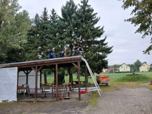 Dank der großzügigen Spenden durch die Firmen Koch Kiessand GmbH und Containerdienst Seyfarth GmbH sowie den tatkräftigen Einsatz unserer fleißigen Helfer konnte das Carportdach erfolgreich repariert werden. Die neue Blechabdeckung sorgt dafür, dass der Unterstand nun wieder zuverlässig genutzt werden kann – sei es bei Vereinsfesten, Veranstaltungen oder als geschützter Treffpunkt.
