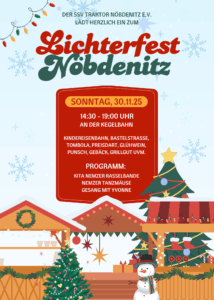 Am 30. November 2025 laden wir herzlich zum Lichterfest an der Kegelbahn Nöbdenitz ein! Von 14:30 bis 19:00 Uhr erwartet euch ein stimmungsvoller Nachmittag für die ganze Familie. Freut euch auf Kindereisenbahn, Bastelstraße, Tombola und Preisdart – sowie auf Glühwein, Punsch, Gebäck, Grillgut und vieles mehr.