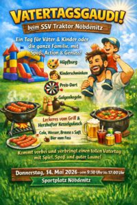 Am Donnerstag, den 14. Mai 2026, lädt der SSV Traktor Nöbdenitz herzlich zur Vatertagsgaudi auf dem Sportplatz Nöbdenitz ein. Von 9:30 bis 17:00 Uhr erwartet Väter, Kinder und natürlich die ganze Familie ein erlebnisreicher Tag voller Spaß, Action und guter Stimmung.