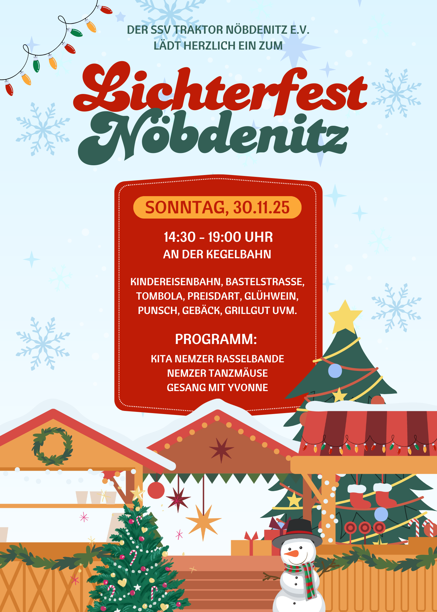 Am 30. November 2025 laden wir herzlich zum Lichterfest an der Kegelbahn Nöbdenitz ein! Von 14:30 bis 19:00 Uhr erwartet euch ein stimmungsvoller Nachmittag für die ganze Familie. Freut euch auf Kindereisenbahn, Bastelstraße, Tombola und Preisdart – sowie auf...